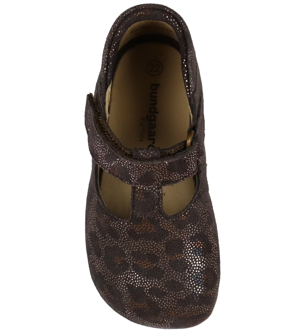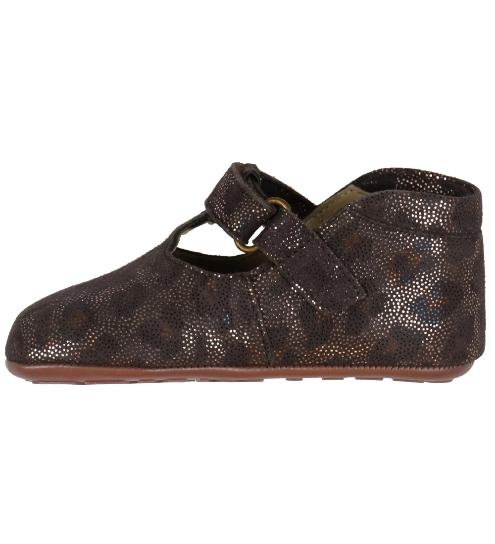 Skønne Bundgaard ballerina hjemmesko i brunt ruskind med et allover-print af sølvfarvet, skinnende prikker samt et skinnende, maskeret leopardprint.