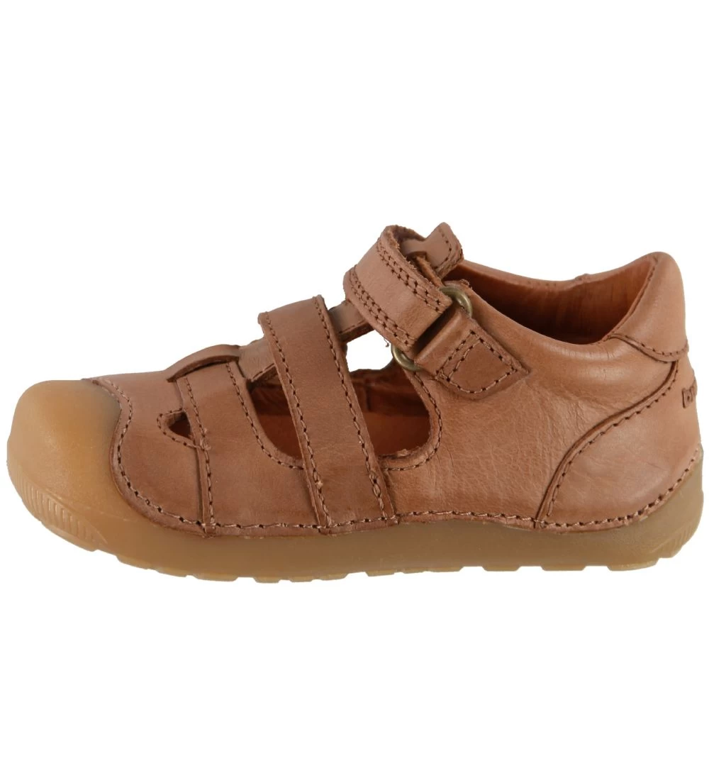 Flotte Bundgaard begyndersandaler i karamel-brun læder med flotte syningsdetaljer.