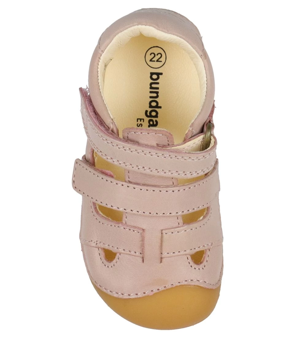 Bundgaard begyndersandalerne lukkes over vristen med to velcrobånd, så de bedst muligt tilpasses barnets fod. Sandalerne er godt polstret omkring anklerne, så de ikke kommer til at genere, indvendigt er de beklædte med skind og i bunden er der en blød og fast indersål. Sandalen er i en praktisk lukket model der støtter og beskytter de små fødder.