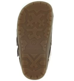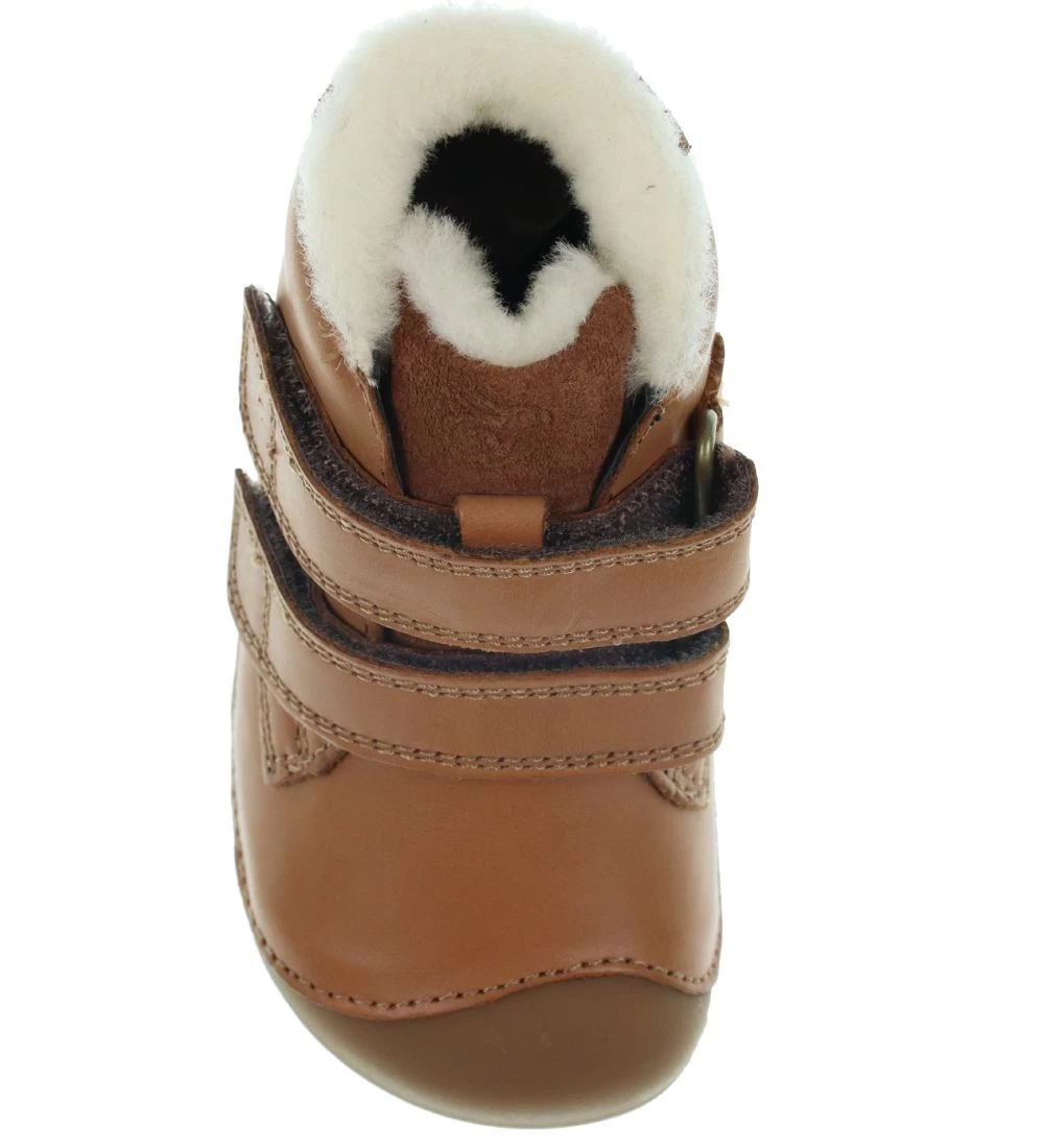 Bundgaard begynderskoene har praktiske velcro-remme over vristen, som nemt åbnes og lukkes. Skoene har en blød forret inderside med et hvidt tykt for. Begynderskoene er bløde og bevægelige med en brun gummi-sål på ydersiden som går op over snuden og godt op i hælen.