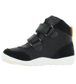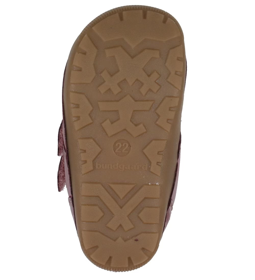 Bundgaard begynderskoene har praktiske velcro-remme over vristen, som nemt åbnes og lukkes. Skoene har en blød forret inderside med et hvidt tykt for. Begynderskoene er bløde og bevægelige med en brun gummi-sål på ydersiden som går op over snuden og godt op i hælen.