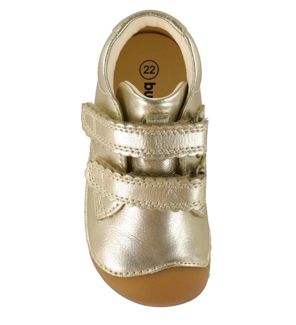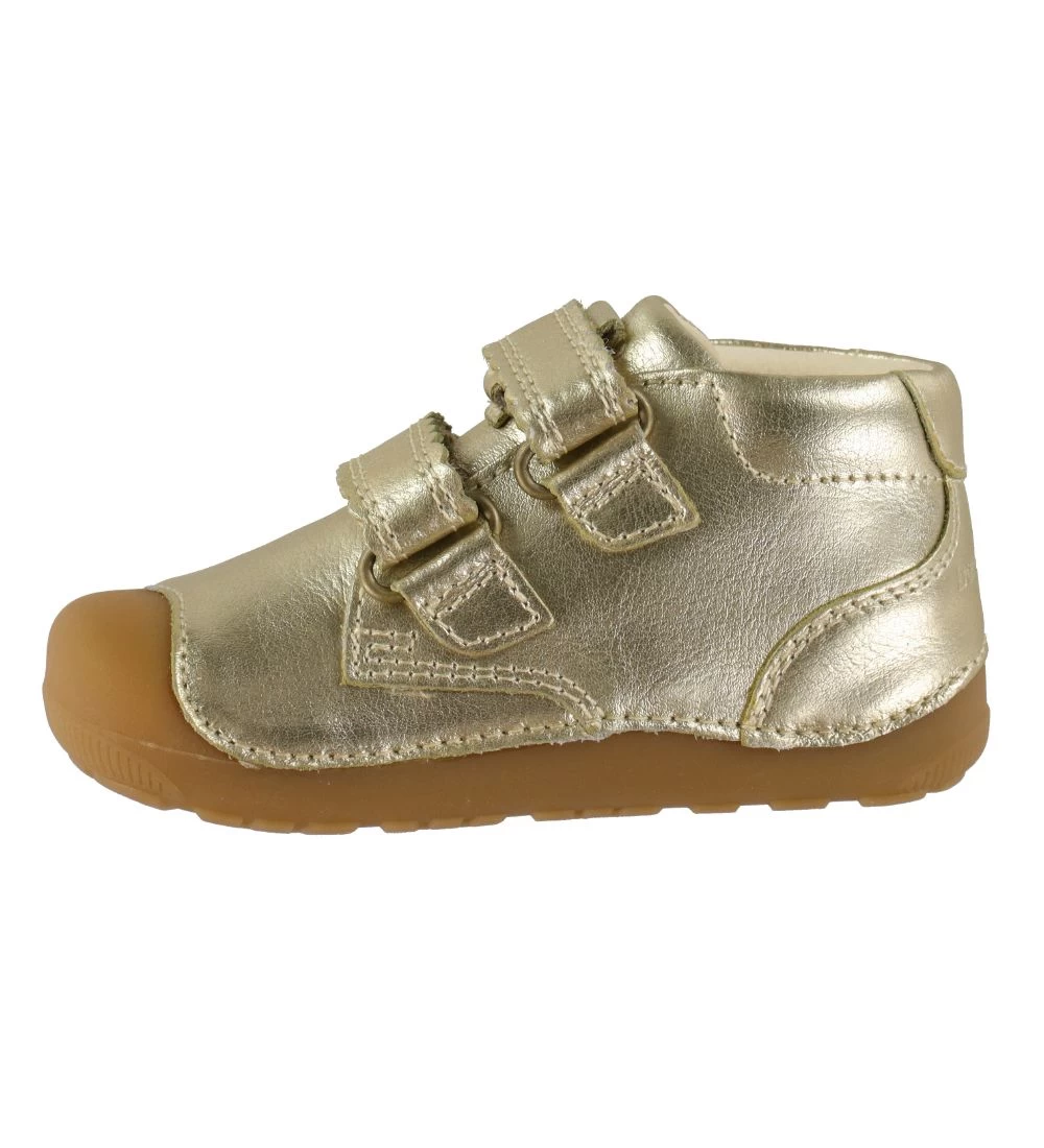 Smukke Bundgaard begyndersko i metalisk, gylden læder med flotte syningsdetaljer, og en lille, indpræget kanin på pløsen samt “bundgaard” bagtil.