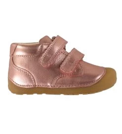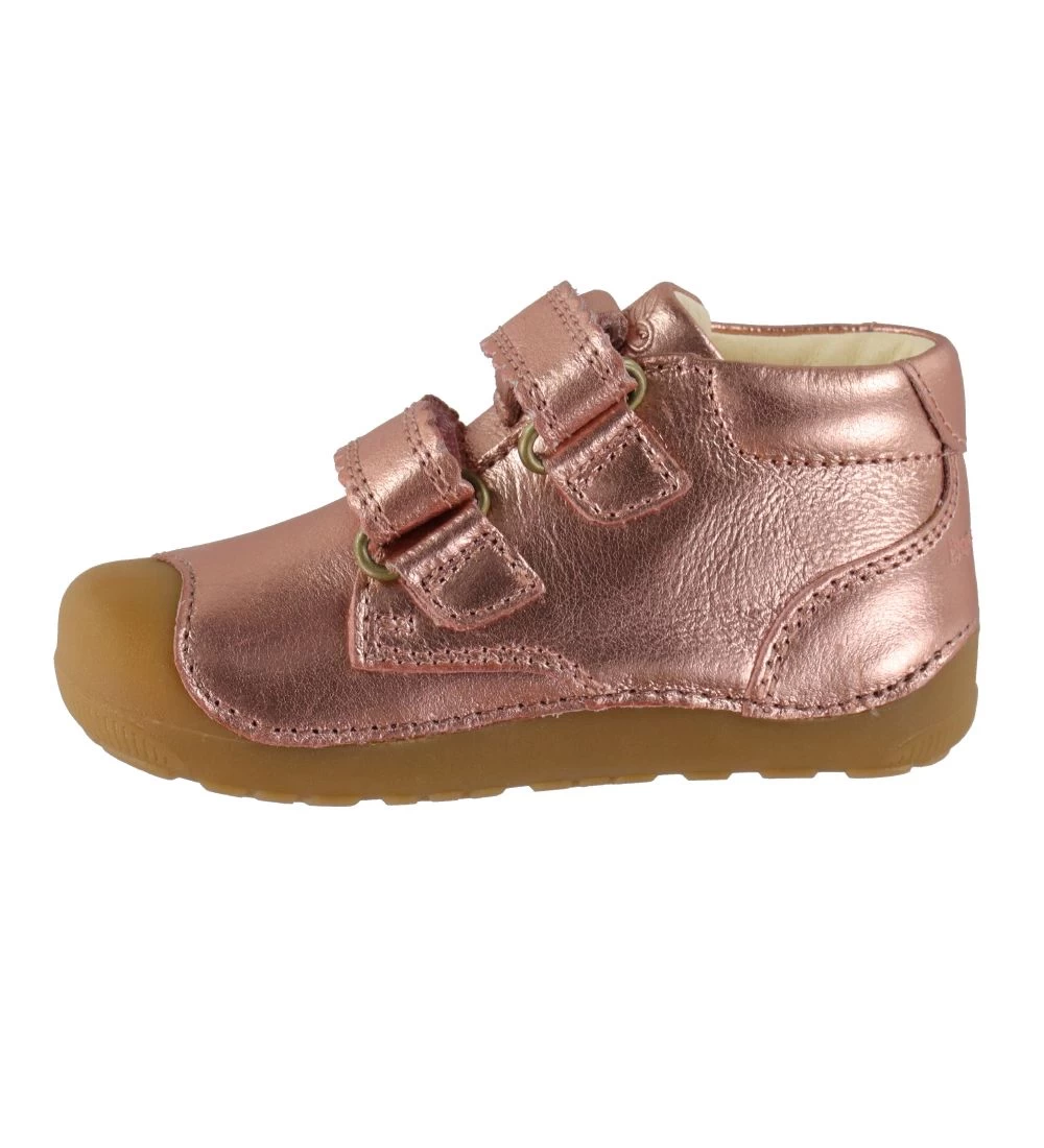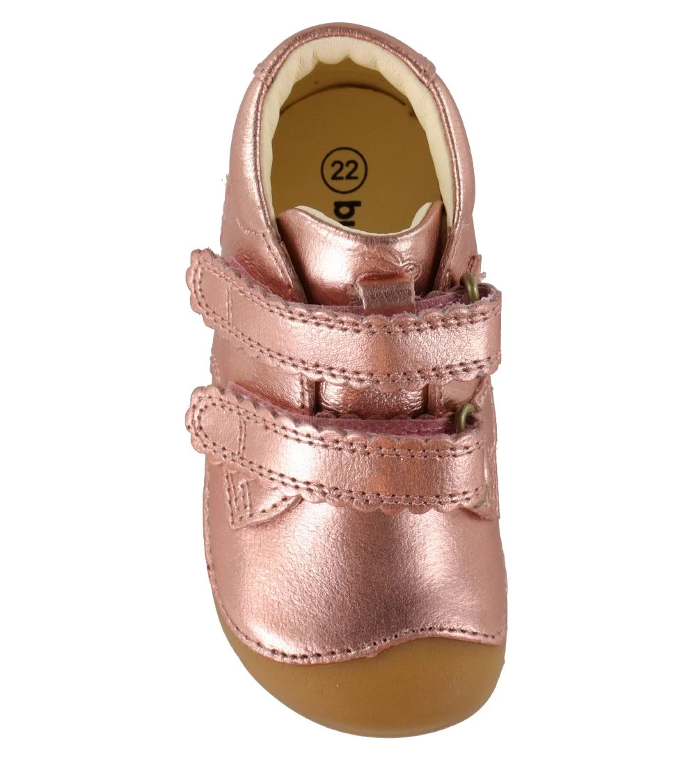 Smukke Bundgaard begyndersko i metalisk, rosa læder med flotte syningsdetaljer, og en lille, indpræget kanin på pløsen samt “bundgaard” bagtil.