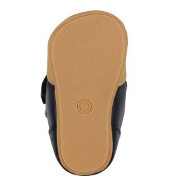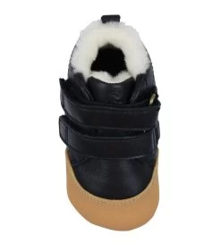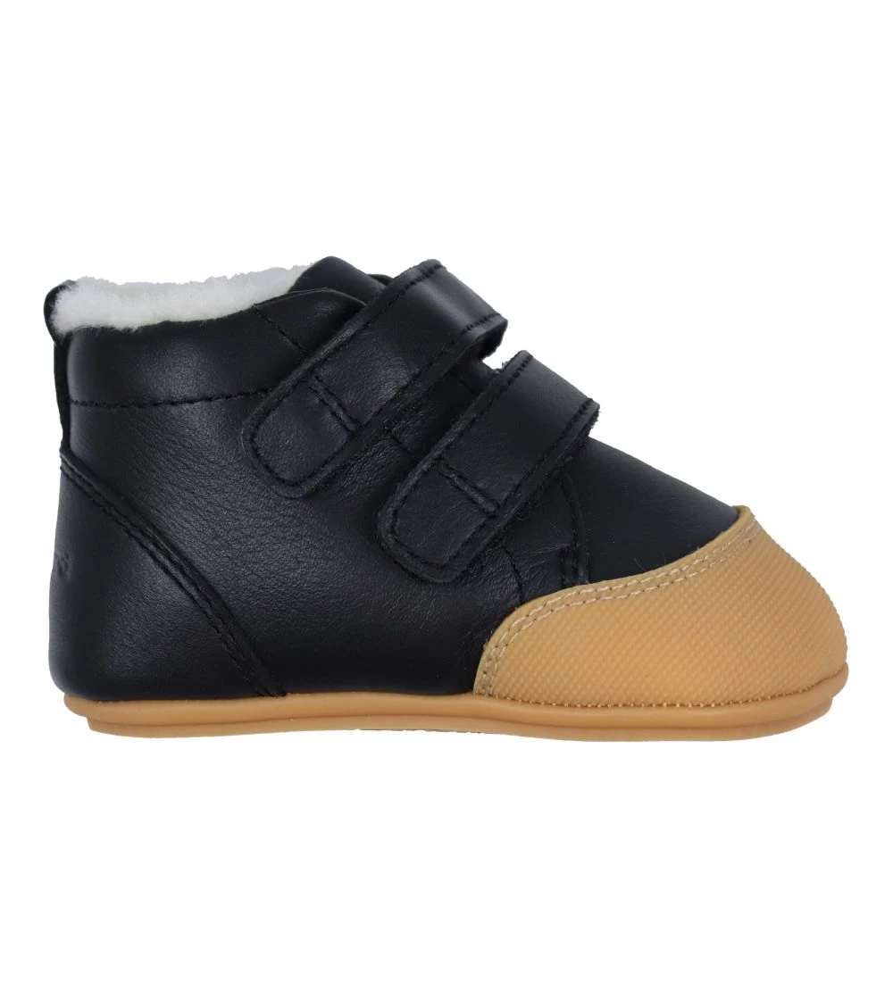 Smarte Bundgaard begyndersko i sort skind, med en brun ydersål som går op over tæerne. Den klassiske Bundgaard-kanin er præget ind i materialet på pløsens top og på hælen er mærkets navn.