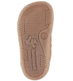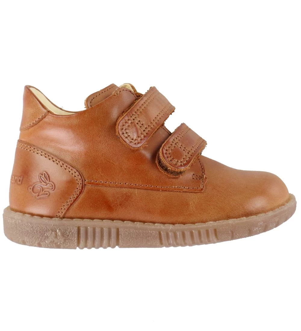 Søde Bundgaard begyndersko i lysebrun læder med en lille, indpræget kanin tæt ved hælen.