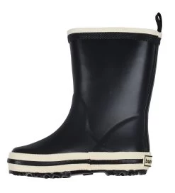 Lækre Bundgaard gummistøvler i ensfarvet sort. På hælen og øverst på skaftet er der på ydersiden et hvidt mærke med navnet “Bundgaard” i sort. Skaftet har en smal, hvid kant i toppen, og hele vejen rundt om sålen er der en bred, hvid kant med en smal, sort stribe i midten.