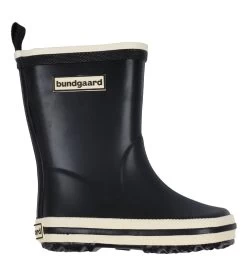 Lækre Bundgaard gummistøvler i ensfarvet sort. På hælen og øverst på skaftet er der på ydersiden et hvidt mærke med navnet “Bundgaard” i sort. Skaftet har en smal, hvid kant i toppen, og hele vejen rundt om sålen er der en bred, hvid kant med en smal, sort stribe i midten.