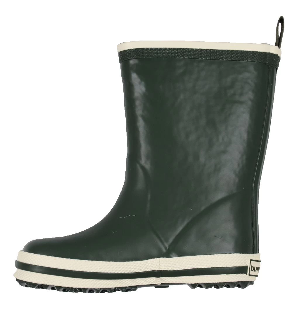 Fede Bundgaard gummistøvler i ensfarvet mørkegrøn. På hælen og øverst på skaftet er der på ydersiden et hvidt mærke med navnet “Bundgaard”. Skaftet har en smal, hvid kant, og hele vejen rundt om sålen er der en hvid stribe med en smal, grøn stribe i midten.