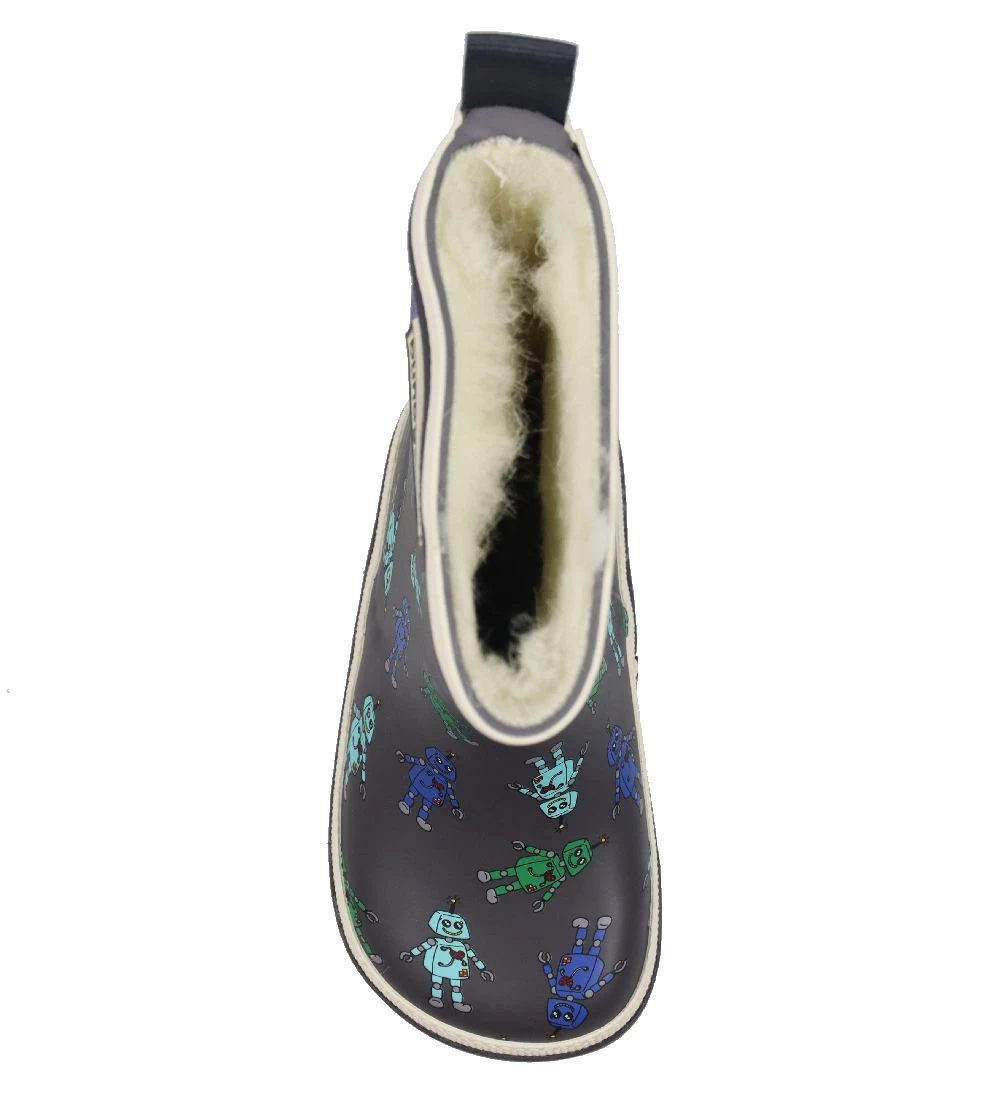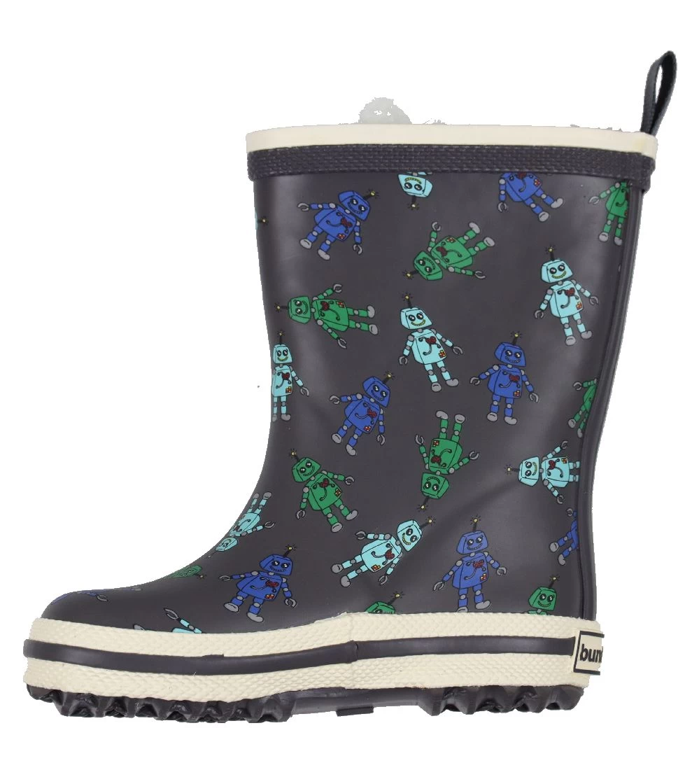 Fede Bundgaard gummistøvler i grå, med print af robotter i blå, turkis og grøn over det hele. På hælen og øverst på skaftet er der på ydersiden et hvidt mærke med navnet “Bundgaard”. Skaftet har en smal, hvid kant, og hele vejen rundt om sålen er der en hvid stribe med en smal, grå stribe i midten.