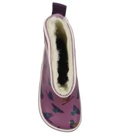 Fede Bundgaard gummistøvler i lilla, med print af fugle i fine nuancer over det hele. På hælen og øverst på skaftet er der på ydersiden et hvidt mærke med navnet “Bundgaard”. Skaftet har en smal, hvid kant, og hele vejen rundt om sålen er der en hvid stribe med en smal, lilla stribe i midten.