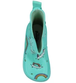 Lækre Bundgaard gummistøvler i turkis med allover print af regnbuer. Fortil og på hælerne er der et mærke med navnet “Bundgaard” i hvid, og hele vejen rundt langs sålerne er der en smal, hvid stribe.