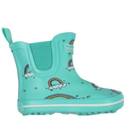Lækre Bundgaard gummistøvler i turkis med allover print af regnbuer. Fortil og på hælerne er der et mærke med navnet “Bundgaard” i hvid, og hele vejen rundt langs sålerne er der en smal, hvid stribe.