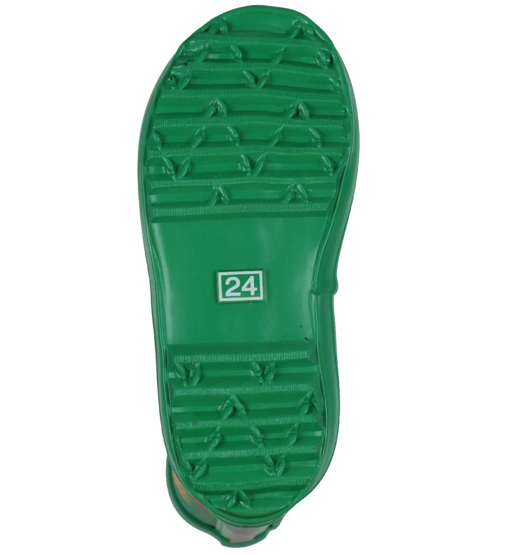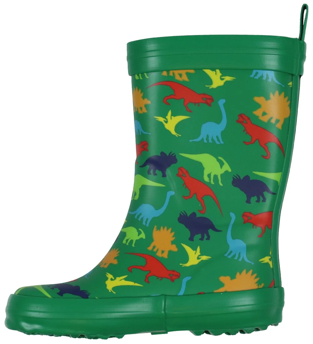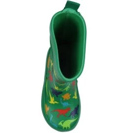 Lækre Bundgaard gummistøvler i grøn med allover print af dinosaurer i forskellige farver. Øverst på skaftet er der på ydersiden et grønt mærke med navnet “Bundgaard”.