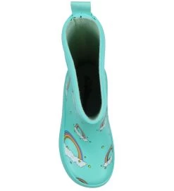 Lækre Bundgaard gummistøvler i turkis med allover print af regnbuer. Øverst på skaftet er der på ydersiden et turkis mærke med navnet “Bundgaard”.