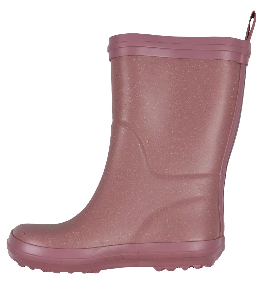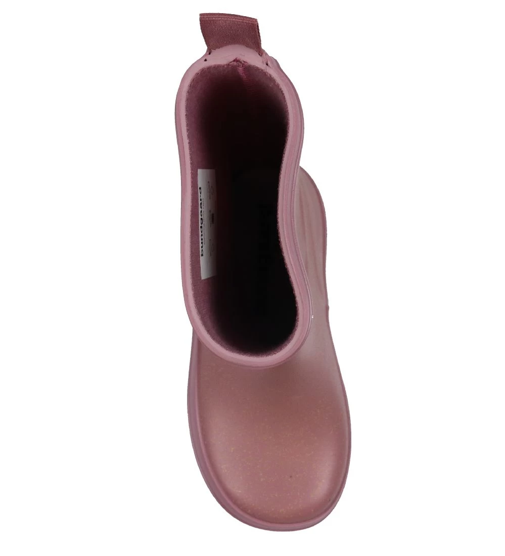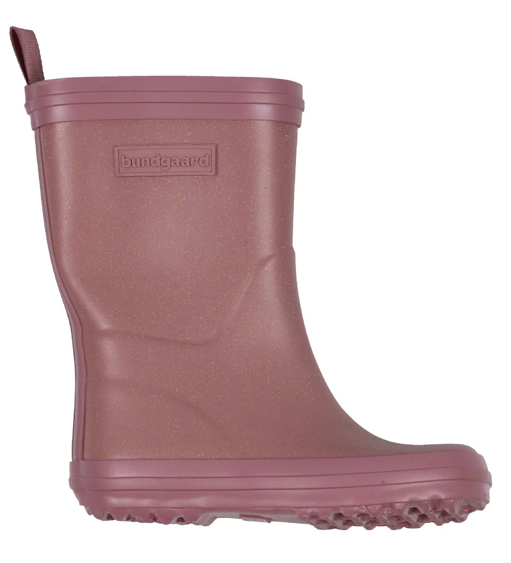 Lækre Bundgaard gummistøvler i rosa med glimmer. Øverst på skaftet er der på ydersiden et rosa mærke med navnet “Bundgaard”.