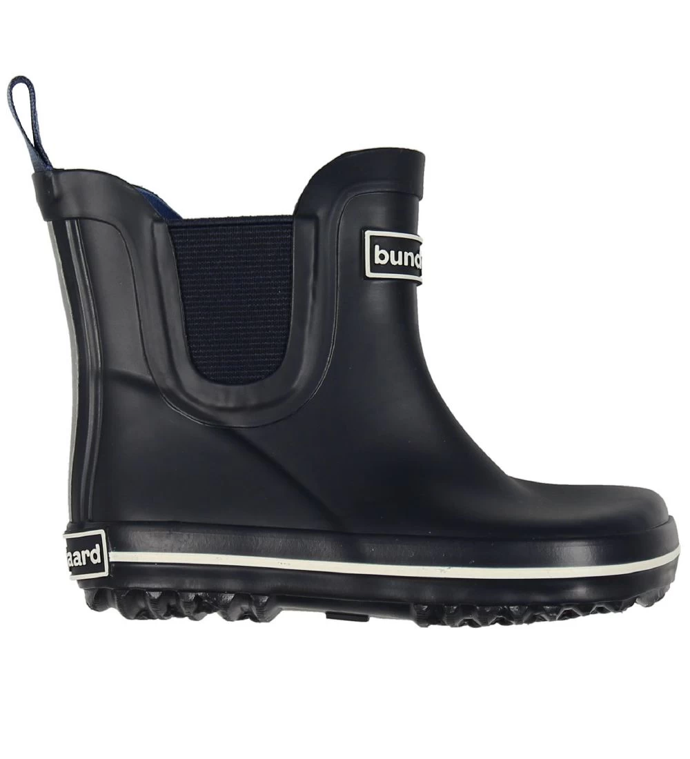 Lækre Bundgaard gummistøvler i navy. Ydersiderne er dekorerede med elastik. Fortil og på hælerne er der et mærke med navnet “Bundgaard” i hvid, og hele vejen rundt langs sålerne er der en smal, hvid stribe.