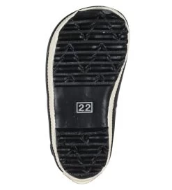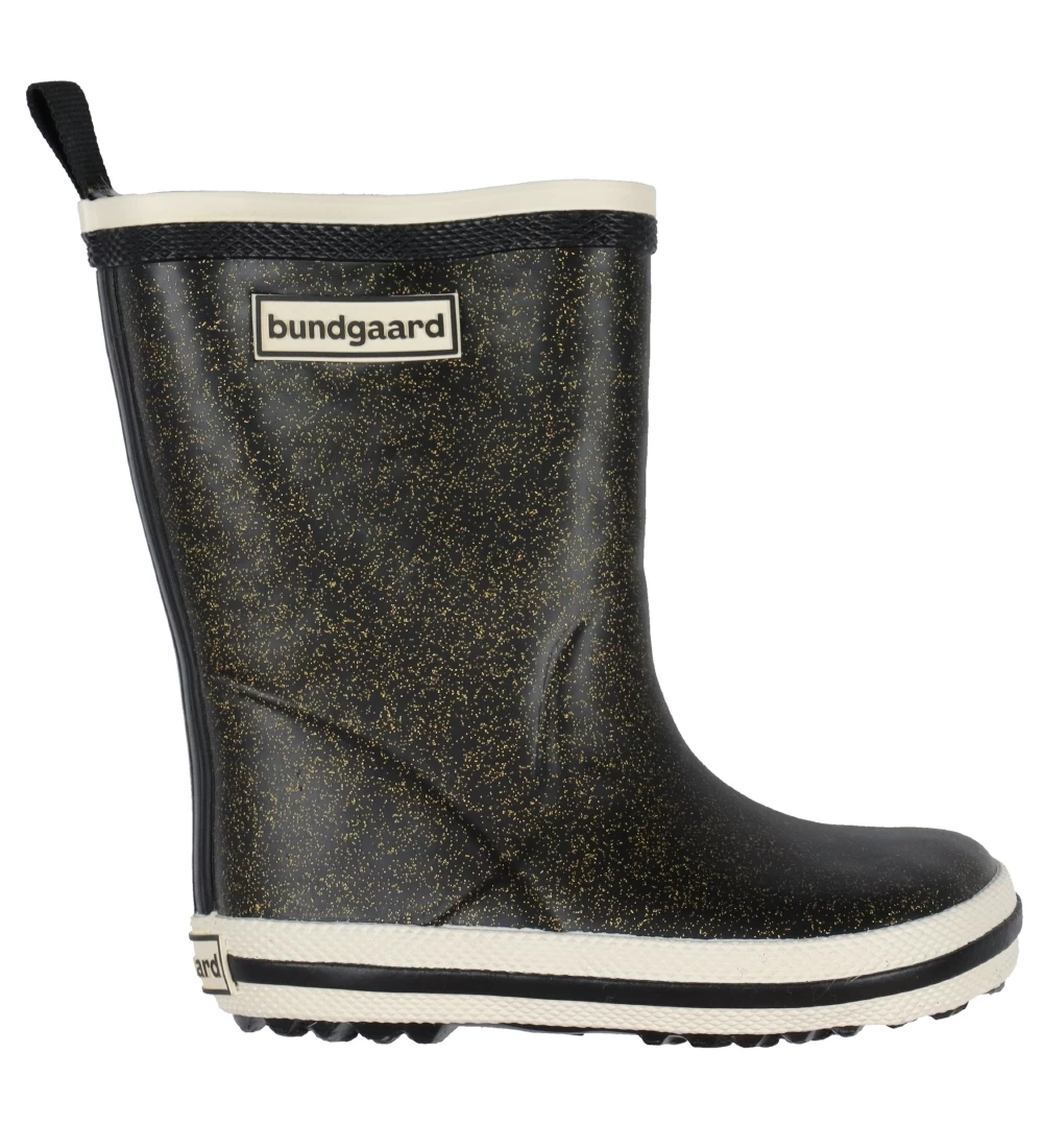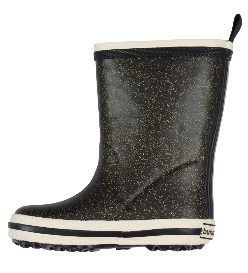 Smarte Bundgaard gummistøvler i sort med guld glimmer. På hælen og øverst på skaftet er der på ydersiden et hvidt mærke med navnet “Bundgaard” i sort. Skaftet har en smal, hvid kant, og hele vejen rundt om sålen er der en hvid stribe med en smal, sort stribe i midten.