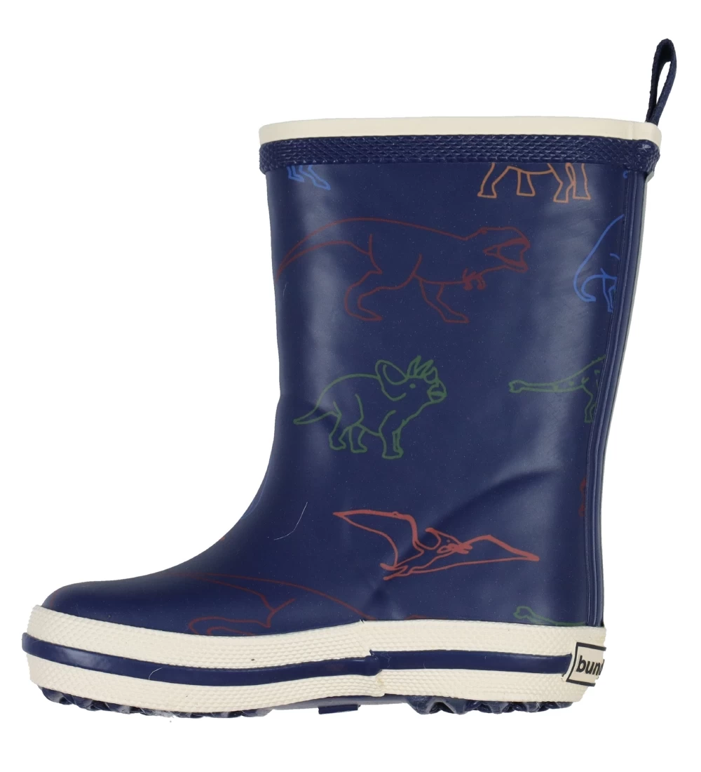 Seje Bundgaard gummistøvler i navy blå med et allover print af dinosaurer i forskellige farver outline. På hælen og øverst på skaftet er der på ydersiden et hvidt mærke med navnet “Bundgaard” i blå. Skaftet har en smal, hvid kant, og hele vejen rundt om sålen er der en blå stribe med en smal, sort stribe i midten.