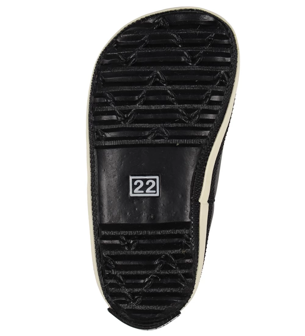 Lækre Bundgaard gummistøvler i sort med elastik i skaftet. Fortil og på hælerne er der et mærke med navnet “Bundgaard” i hvid, og hele vejen rundt langs sålerne er der en smal, hvid stribe.