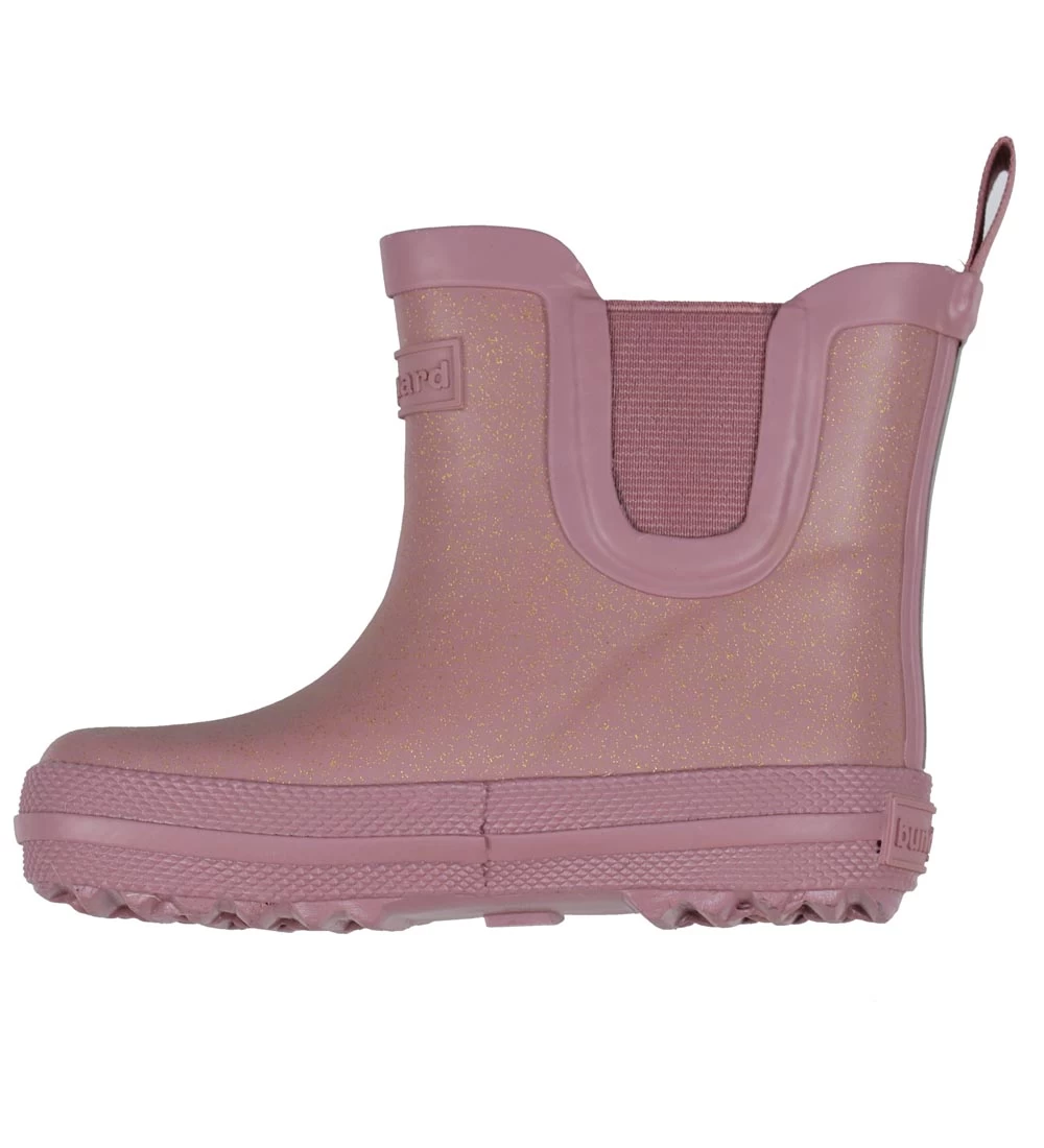 Lækre Bundgaard gummistøvler i rosa med guldglimmer og elastik i skaftet. Fortil og på hælerne er der et mærke med navnet “Bundgaard” i rosa.