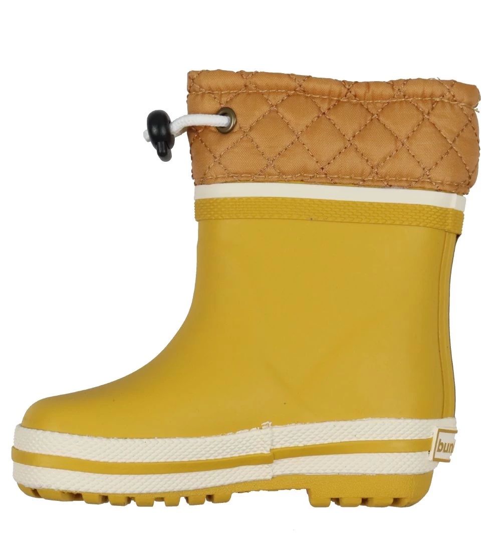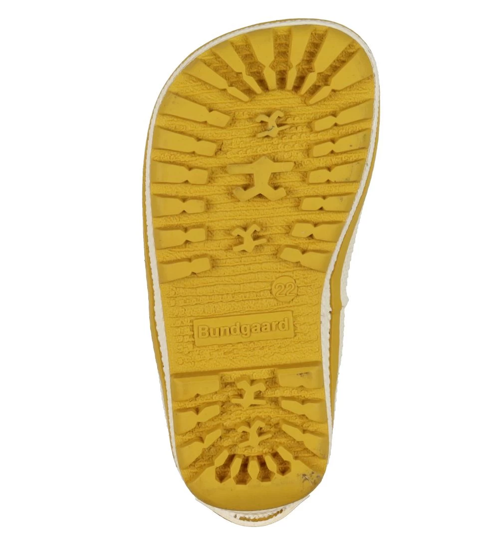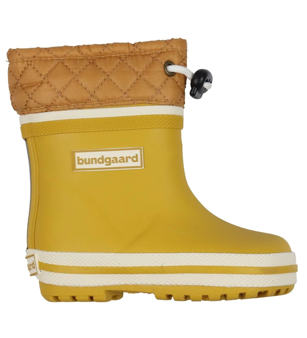Flotte Bundgaard termostøvler i gul, med to hvide stribe omkring sålen og en omkring skaftet.