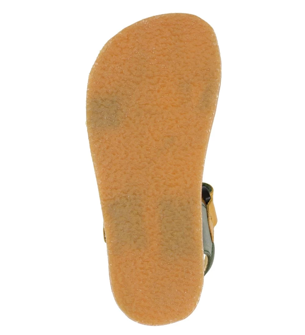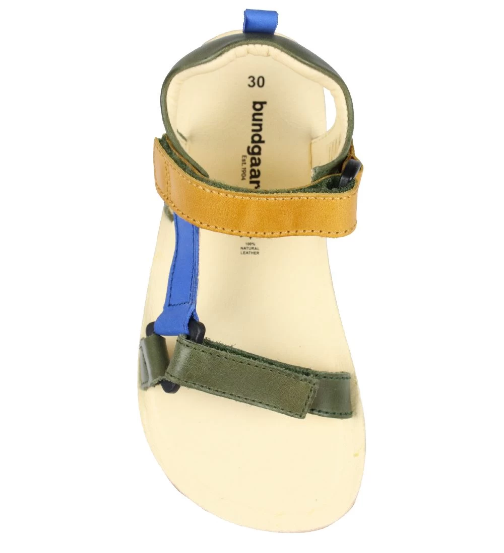 Søde Bundgaard sandaler i grøn skind med en rem i en blå nuance samt den øverste velcrorem i gul.