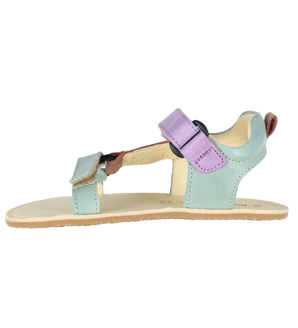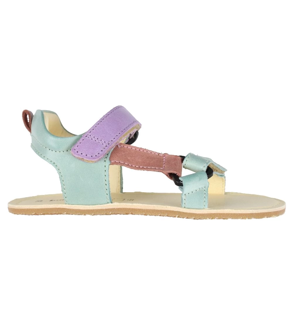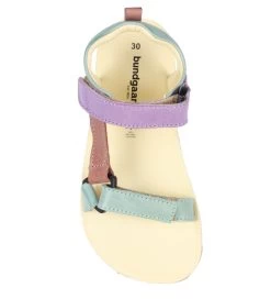 Søde Bundgaard sandaler i blå skind med en rem i en mørkerosa nuance samt den øverste velcrorem i lilla.