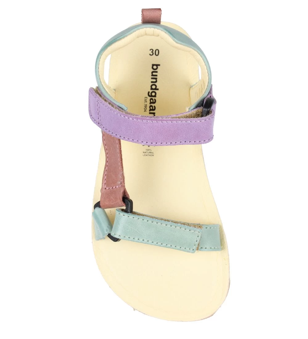 Bundgaard sandalerne er i en åben model, som åbnes med praktiske velcroremme over foden og vristen. Der er en smal strop omkring hælen, så de sidder godt fast på foden og indvendigt er der glat skind på indersiden af stropperne. Indersålen er i en blød læderkvalitet og ydersålen er brun, med et praktisk mønster under bunden som sikrer et godt fodfæste.