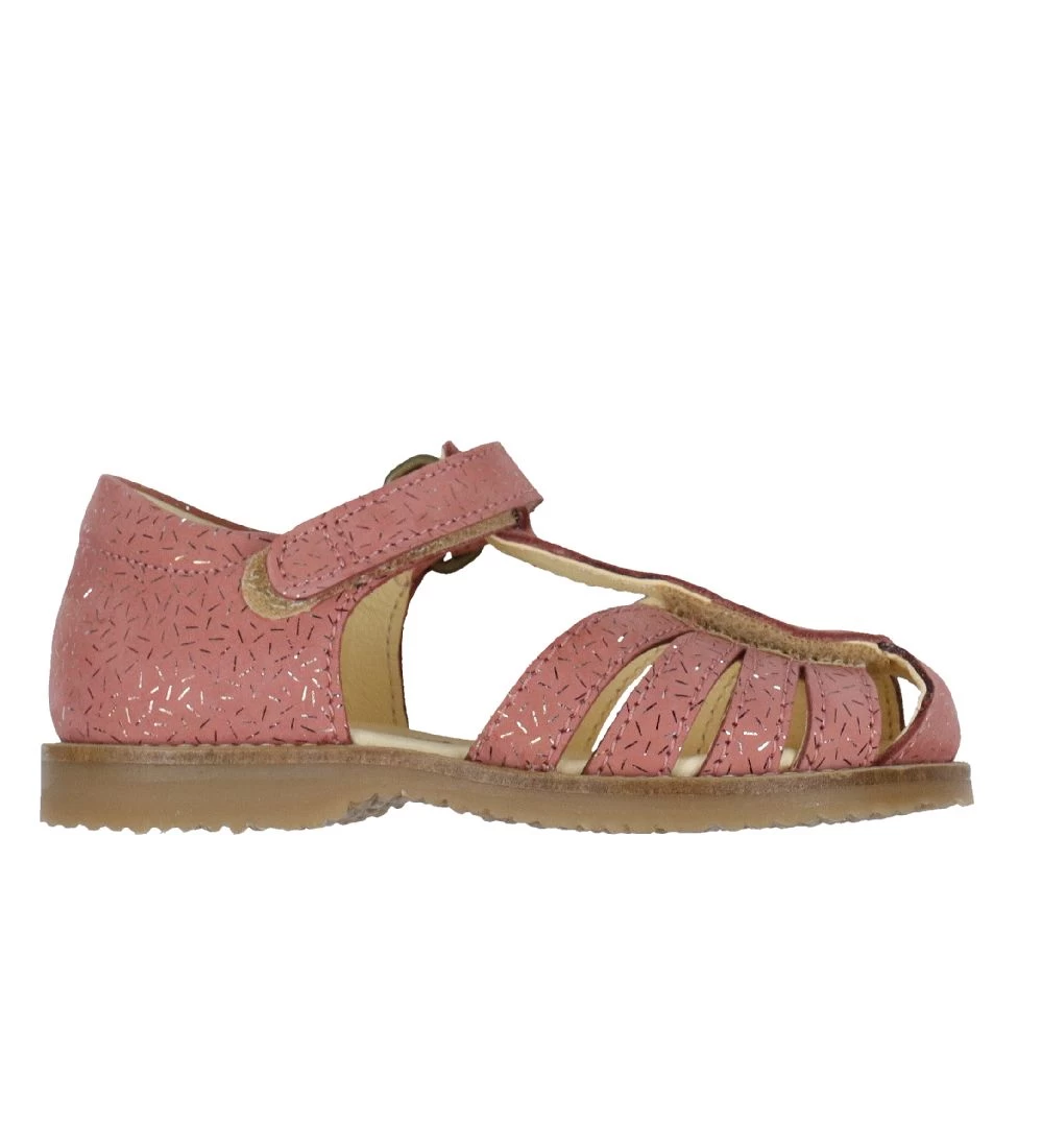 Søde Bundgaard sandaler i rosa ruskind med et print af små streger i guld.