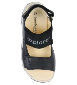 Lækre Bundgaard sandaler i sort skind med smarte remme. På den ene rem står teksten “Explorer”.