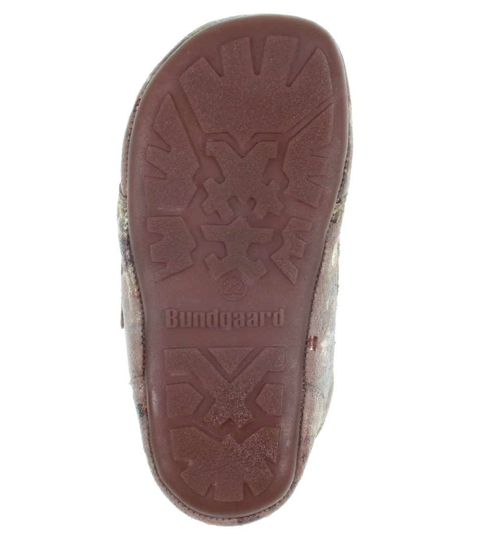 Lækre Bundgaard skindfutter i rosa ruskind med et camouflageprint i guld og bronze.
