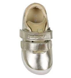Yndige Bundgaard sko i skinnende guldfarvet skind med ruskinds detaljer på pløsen. På øverste velcrorem er “bundgaard” trykt ind i skindet.