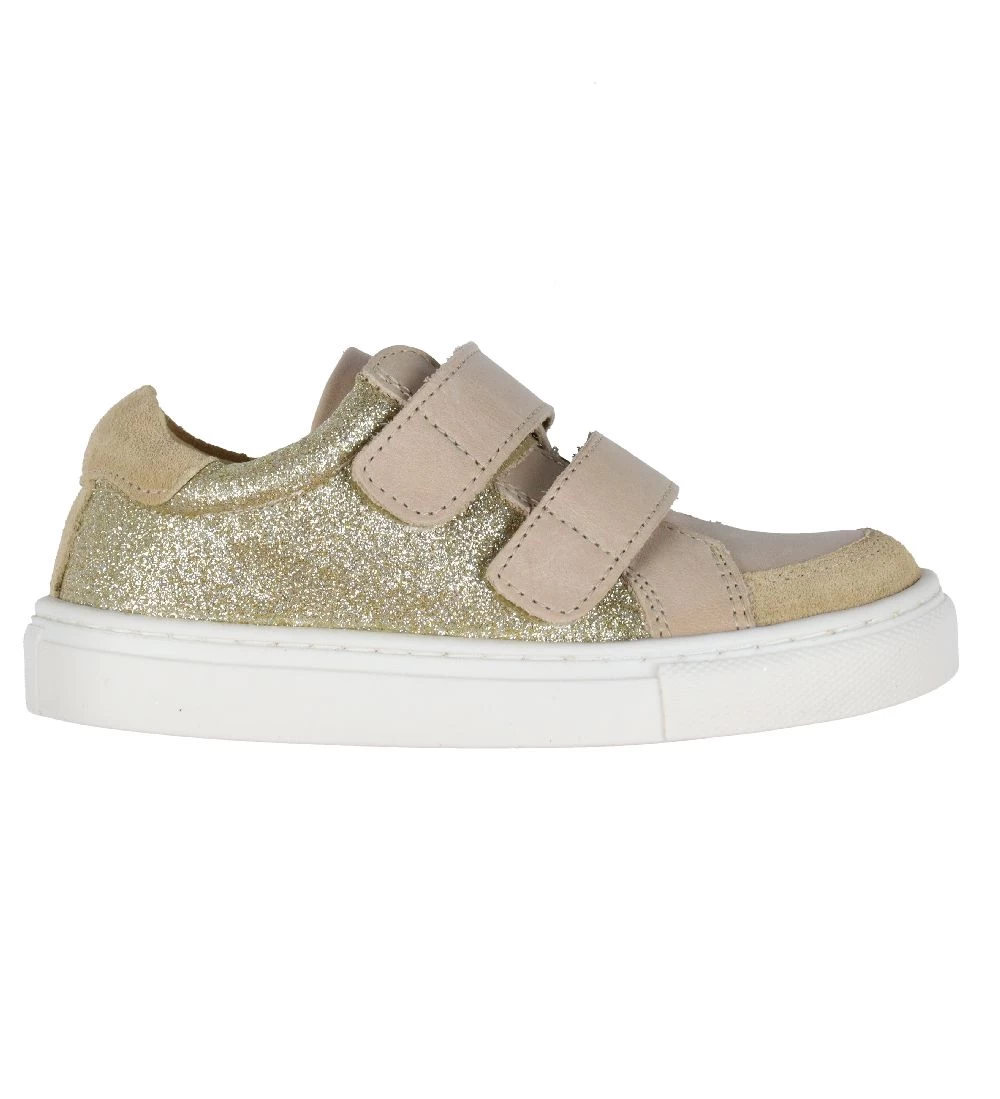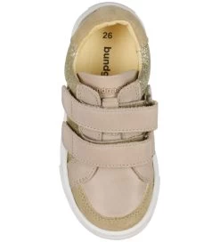 Yndige Bundgaard sko i rosa skind med ruskinds detaljer og guld glimmer på begge sider. På pløsen er “bundgaard” trykt ind i skindet.
