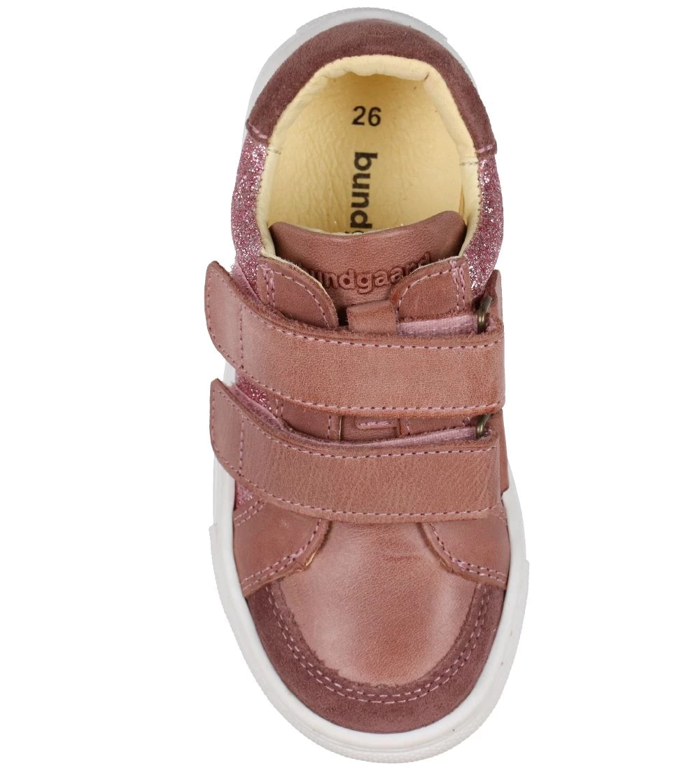 Yndige Bundgaard sko i mørkerosa skind med ruskinds detaljer og glimmer på begge sider. På pløsen er “bundgaard” trykt ind i skindet.