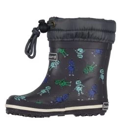 Fede Bundgaard termostøvler i grå naturgummi, med print af robotter i blå, turkis og grøn over det hele. Støvlerne har en hvid stribe omkring sålen.