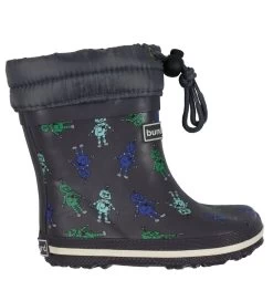 Fede Bundgaard termostøvler i grå naturgummi, med print af robotter i blå, turkis og grøn over det hele. Støvlerne har en hvid stribe omkring sålen.