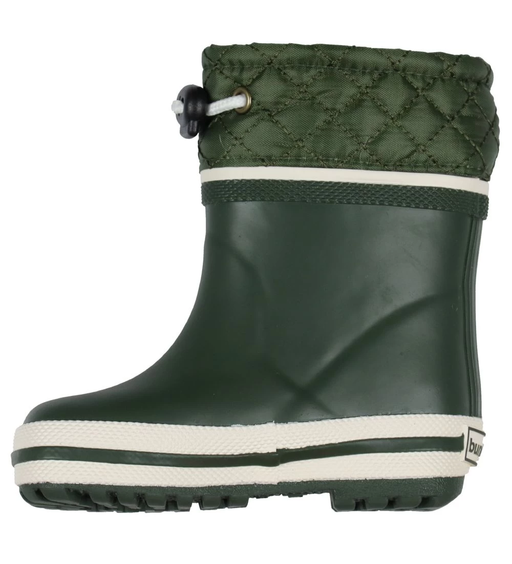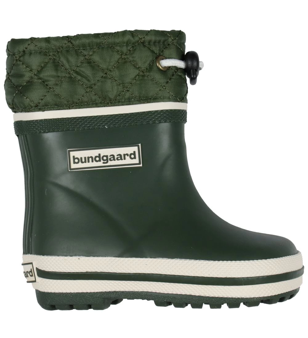 Fine Bundgaard termostøvler i mørkegrøn med en mørkegrøn top i tekstil. På hælen er der et hvidt mærke med navnet “Bundgaard” i mørkegrøn. Skaftet har en smal, hvid kant, og hele vejen rundt om sålen er der en hvid stribe med en smal, mørkegrøn stribe i midten.
