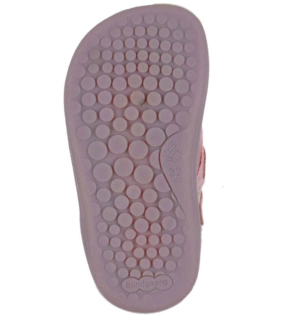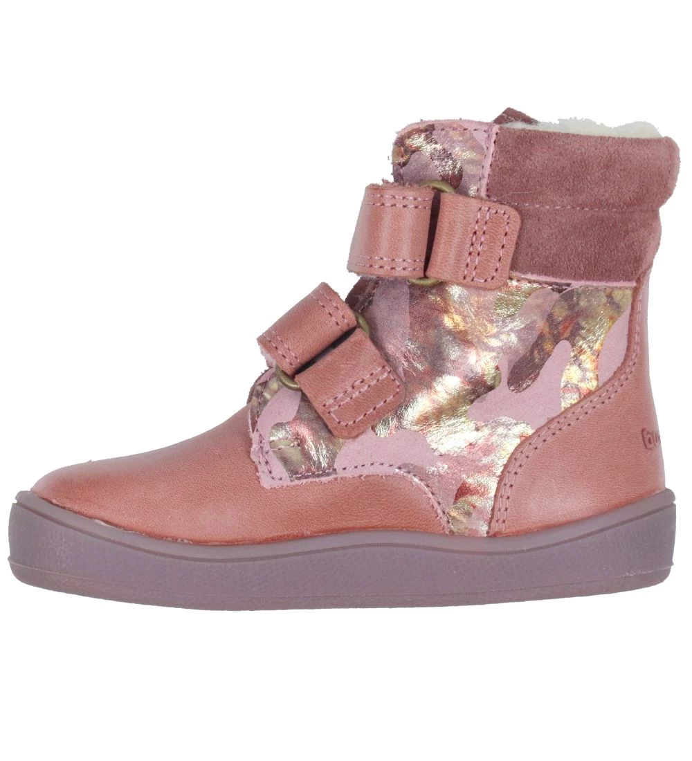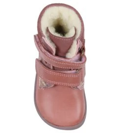 Lækre Bundgaard vinterstøvler i rosa læder og ruskind med en lille kanin og “bundgaard” præget ind på ydersiden af hælen. Skoene har fine detaljer af et flot mønster i skinnende guld og brunlige nuancer.