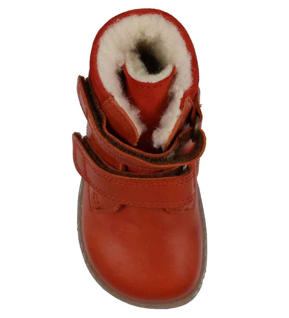 Søde Bundgaard vinterstøvler i rødlig orange læder. Bagtil er der ruskind samt på pløsen. På hælkappen er “bundgaard” og en kanin trykt ind i læderet.