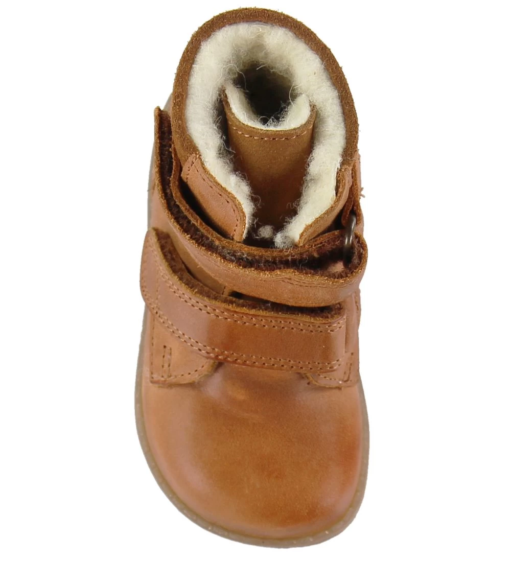 Bundgaard vinterstøvlerne lukkes over vristen med to velcroremme, som kan klippes til uden at remmene går op. Støvlerne har en fast hælkappe, og indvendigt er de foret med blød, hvid uld. I bunden har de en blød og udtagelig indersål.
