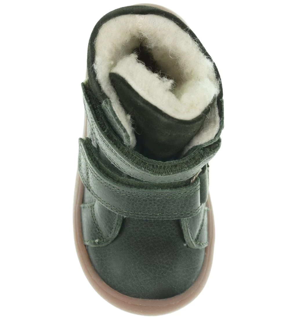 Lækre Bundgaard vinterstøvler i mørkegrønt læder og ruskind med en lille kanin, præget ind på ydersiden af hælen.