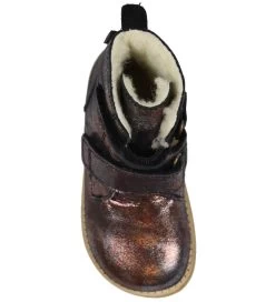 Lækre Bundgaard vinterstøvler i skind med brune, grønne og lilla nuancer med en skinnende overflade.