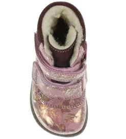 Yndige Bundgaard vinterstøvler i rosa ruskind med et metallisk print i rosa nuancer. Åbningen er i mørkelilla ruskind med vandrette syninger.